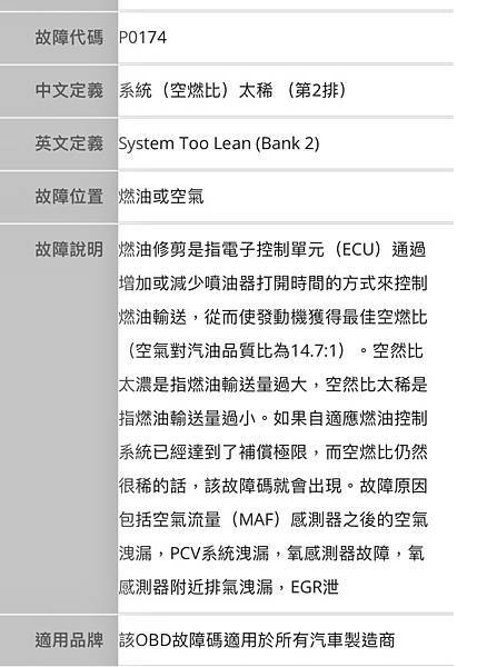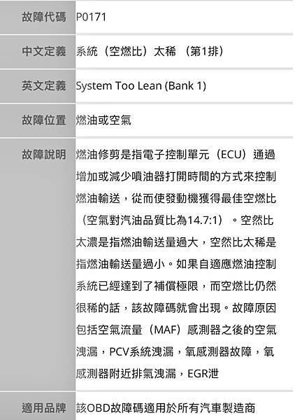十三 . 引擎檢查燈正常,但曾有空燃比過稀的暫存故障碼,再我清除後就沒再出現了。空燃比過稀是環保故障碼,引起的可能原因是:空氣流量計偶發異常。由於車開起來沒有任何異狀,油耗也都正常,所以我就沒處理了。