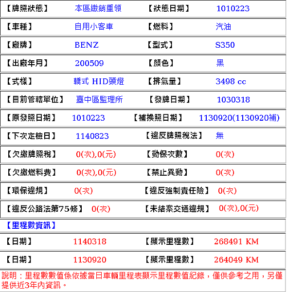 這是此車的車籍資料/ 監理站資料/ 里程數
